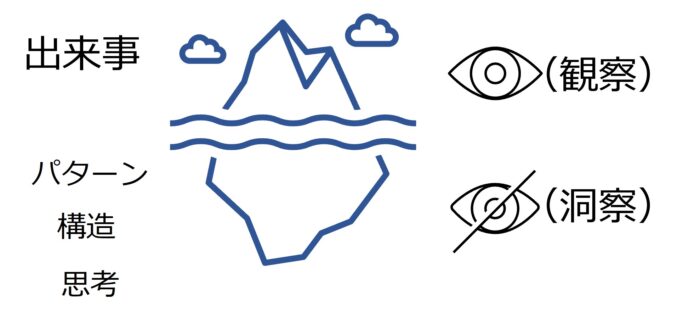 システム思考(記事:システム思考とは)では、経営をシステム(仕組み)として捉え、上の図のように直面する出来事のみに注目するのではなく、問題を発生させている状況の全体像を分析する複数のツールを活用し洞察しその構造、思考(意識)を理解した上で、根本原因の解決を図ることができます。